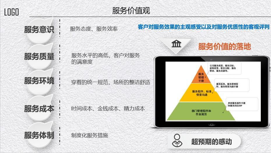 第一,理念是一種模式,技術(shù)服務(wù)型的企業(yè)是把企業(yè)文化定位為用戶為中心,圍繞用戶進(jìn)行發(fā)散和增值服務(wù)。服務(wù)理念是一個(gè)模型,整個(gè)團(tuán)隊(duì)首先要有一個(gè)同樣的理念,實(shí)現(xiàn)團(tuán)隊(duì)作戰(zhàn)。