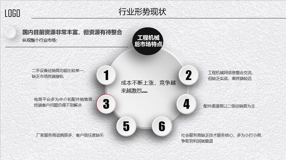 首先是現(xiàn)狀。國(guó)內(nèi)資源非常豐富,我們要將這些資源進(jìn)行整合。1)從二手設(shè)備經(jīng)銷商來(lái)說(shuō),現(xiàn)在的工人和終端客戶的交流相對(duì)較少,缺乏市場(chǎng)終端的機(jī)會(huì),不懂客戶真正的需求。2)工程機(jī)械信息整合交流缺乏實(shí)戰(zhàn),離終端較遠(yuǎn)。3)電商平臺(tái)多為中介和配件經(jīng)銷商,終端客戶問(wèn)題仍得不到解決。4)廠家服務(wù)商詬病多,客戶信任度缺失。5)配件渠道商及二級(jí)經(jīng)銷商為主。6)社會(huì)服務(wù)商缺乏技術(shù)核心,多為小打小鬧,掙錢了就撤退。