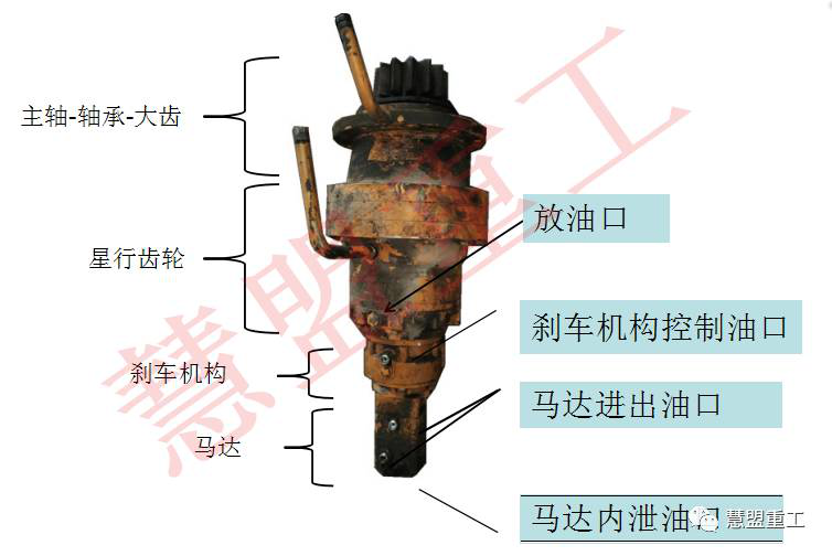 剎車機構竄油到回轉(zhuǎn)減速機內(nèi),是很常見的情況 ,也是我們這次重點講解的對象,我們需要從回轉(zhuǎn)減速機上拆下剎車機構,并進行分解。